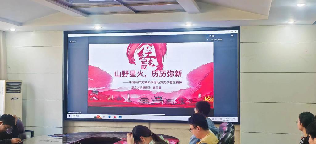 黄雨晨博士首先以井冈山、大别山区、延安三地为线索,串联起了中国共产党的早期历史,重点讲述了发生在这些老区的典型革命故事,如大别山区金寨、红安两县在革命中涌现出的一大批将军的英勇事迹,充分体现了革命老区坚定不移、不屈不饶的革命精神。接着,黄雨晨从历史转入现实,讲述了党的十八大以来,在党中央的正确领导下,全国人民完成了脱贫攻坚的伟大决战,革命老区发生了一些翻天覆地的变化:路通了,学校建起来了,红色资源焕发了新的生机。伟大祖国并未忘记老区,始终关心着革命老区的发展。最后,黄雨晨说老区革命精神历久弥新,不仅体现在革命年代的前辈身上,更体现在新时代的奋斗者中:同时,她鼓励大家细心寻找家乡的革命故事,传承红色基因,赓续红色血脉。