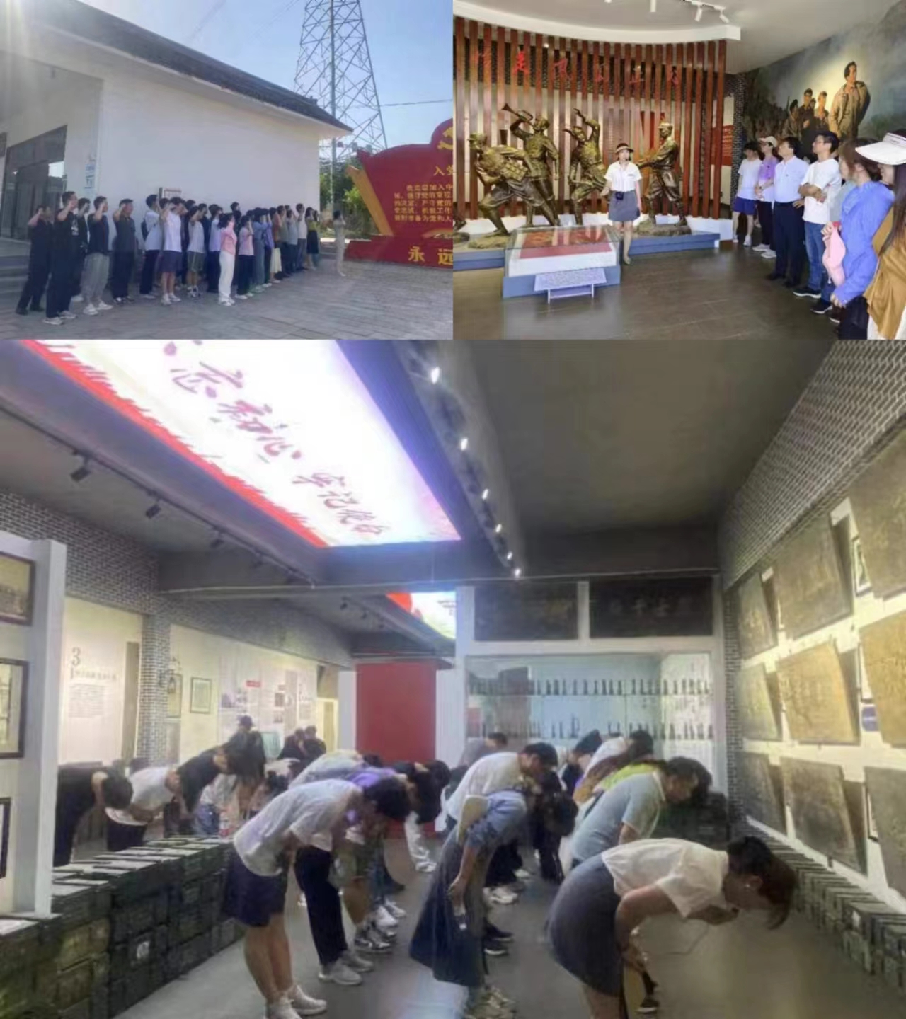在讲解员的带领和讲解下,午夜剧场 师生走进典礼学书文化展览馆。修德养廉教育馆内的弹药箱、石地雷、红色历史碑刻、老照片、书信等历史印记,记录着一段段红色故事,让大家重温了那个战火纷纷的年代。在匾额区前,讲解员介绍了墙上一块块由当地政府部门颁发给在抗日战争、解放战争中牺牲的烈士家属的匾额——“烈士千秋”“烈昭千古”“为民立功”等,其中最小的烈士只有14岁,听到这里,大家都心情沉重,在讲解员的引导下,在牌匾前满含敬意深深鞠躬。是他们坚定的理想信念,铸就了历史的辉煌,成就了我们今天这个伟大时代。大家纷纷表示要踏着他们的足迹,不忘初心,勇毅前行。
