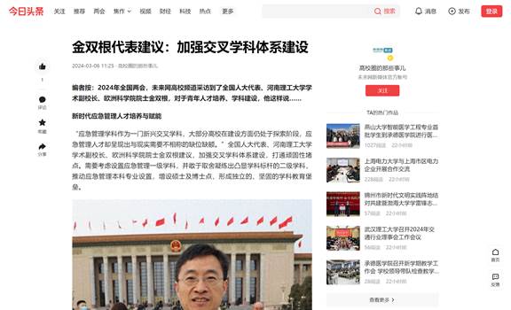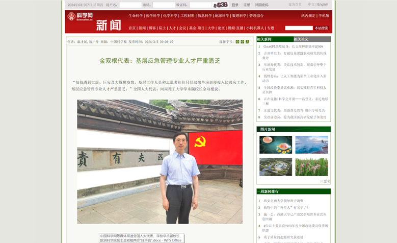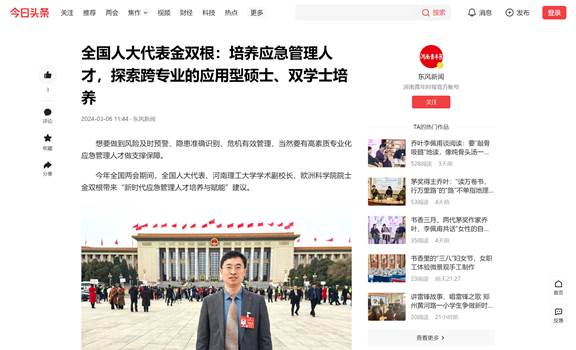 近日,全国人大代表、学术副校长、欧洲科学院院士金双根围绕新时代应急管理人才培养与赋能、加快推进应急公共服务发展等积极建言献策,连日来,河南日报、中国应急管理报、等20家媒体进行了采访报道,具体内容如下: