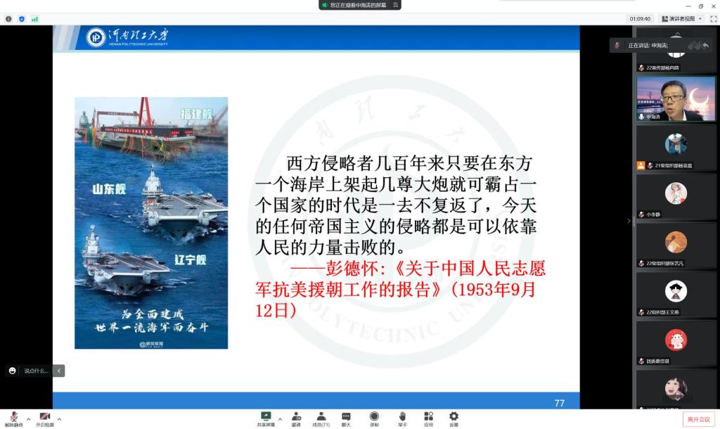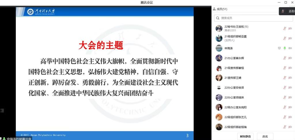 团委于11月27日晚在线上举办学习党的二十大精神专题报告暨“青马工程”培训班第三次理论学习,邀请省委宣传部青年理论宣讲专家申海涛老师做党的二十大精神宣讲报告。院团委书记李静主持报告会,学院“青马工程”培训班全体学员和午夜剧场