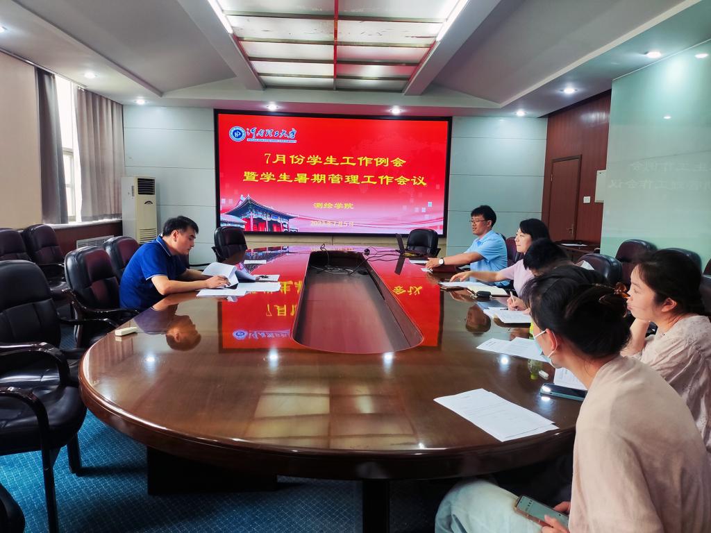于院楼三楼会议室召开本月学生工作例会暨学生暑期管理工作会议。学院党委副书记郭学鹏、学工办主任丰习才、全体专兼职辅导员参加会议。会议由郭学鹏主持。