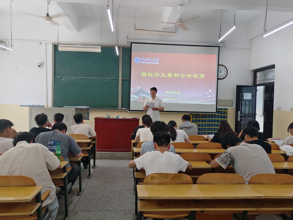 2023年暑假学生安全教育管理通知》,强调学院要高度重视暑期学生安全教育工作,要重点开展学生人身财产安全、消防安全、交通安全、实习实践等安全教育,切实增强学生安全防范意识和自我保护能力。为做好暑期留校学生管理工作,学院组织发放《暑期安全提醒卡》并签订《留校安全承诺书》,确保安全教育提醒和防范内容人人知晓,人人遵照执行。会后,学院各辅导员针对暑期留校学生召开了安全教育会议,传达了学校、学院会议精神,为留校学生的安全做好保障。