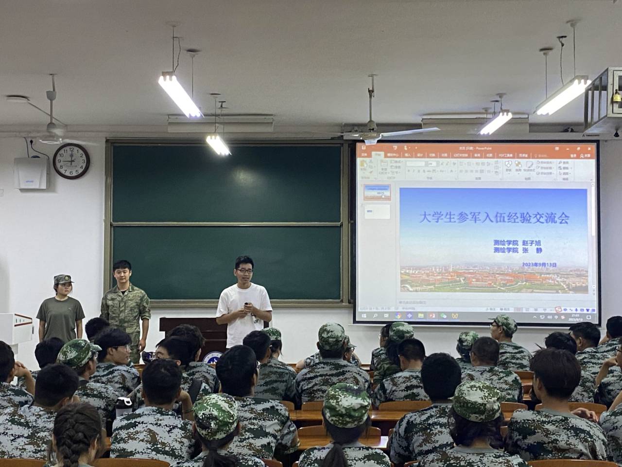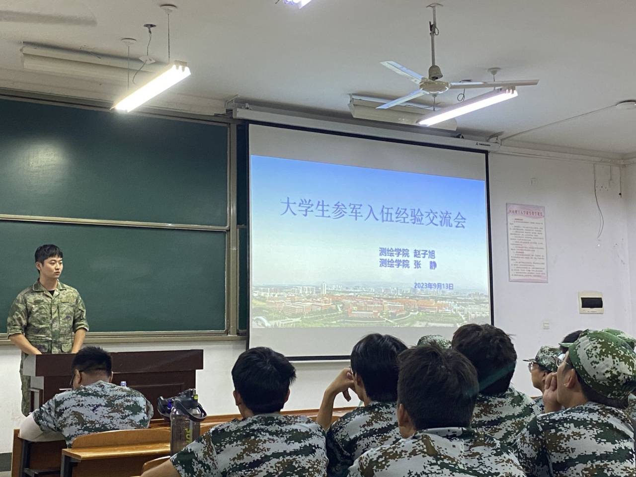 测绘工程(导航方向)2023级1班和2班以及测绘工程2021级3班和4班,于9月13号晚上在三号教学楼3306教室召开大学生参军入伍经验交流会。会议邀请了曾在中国人民解放军空军和火箭军参军入伍的赵子旭、张静同志,分享了他们的参军经历和收获。