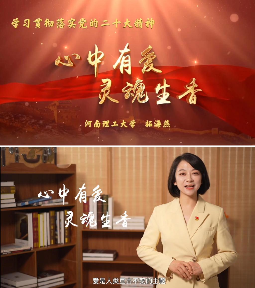 共同指导,以宣传党的二十大精神为主题的视频宣讲作品《心中有爱 灵魂生香》入选高校辅导员队伍能力提升大数据赋能平台,该作品经学校、河南省教工委、中国高等教育学会辅导员工作研究分会逐级审核推荐并成功入选。