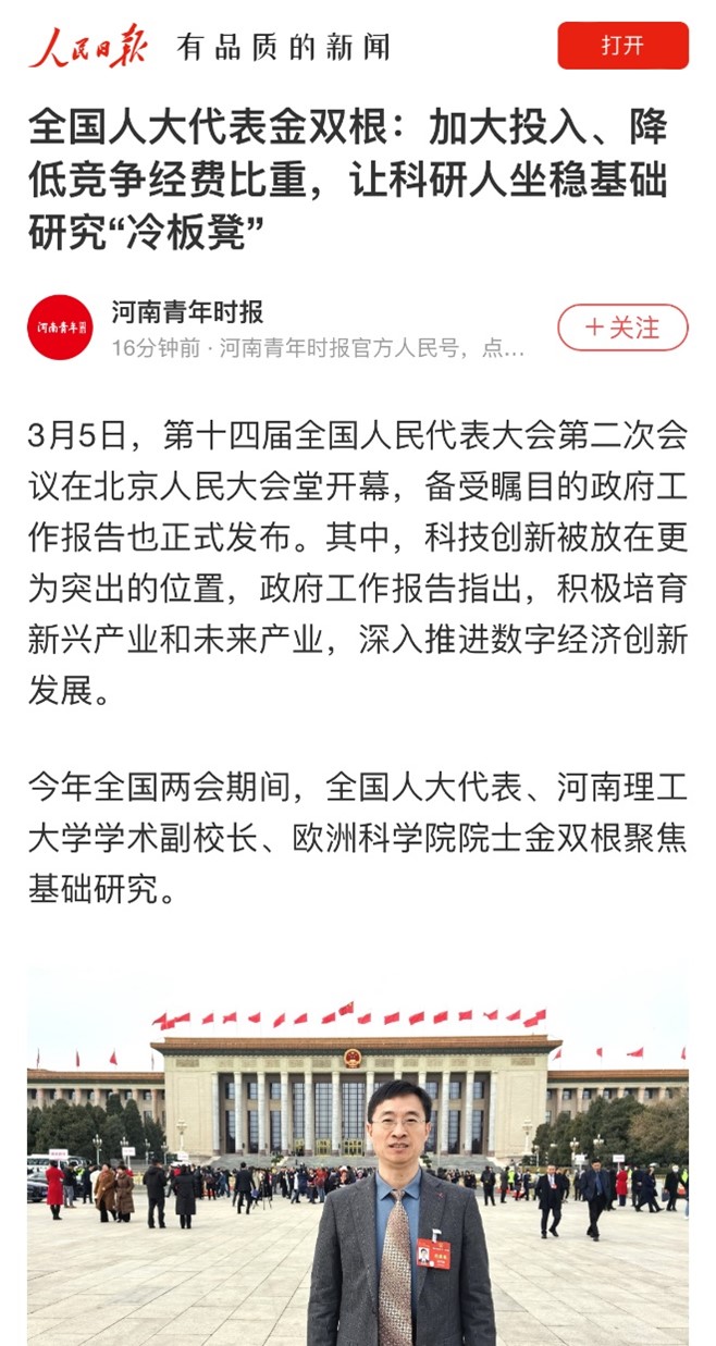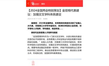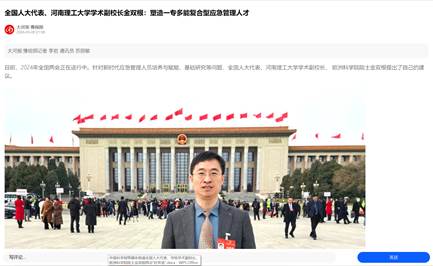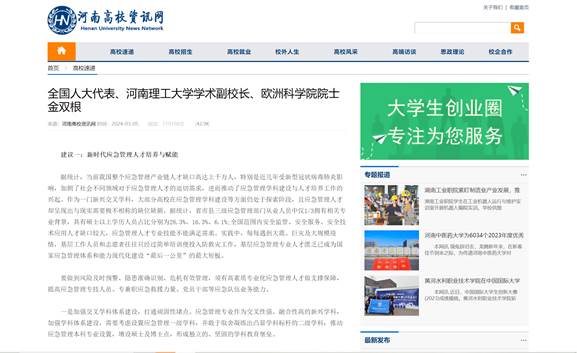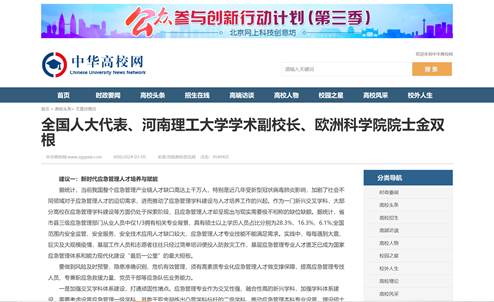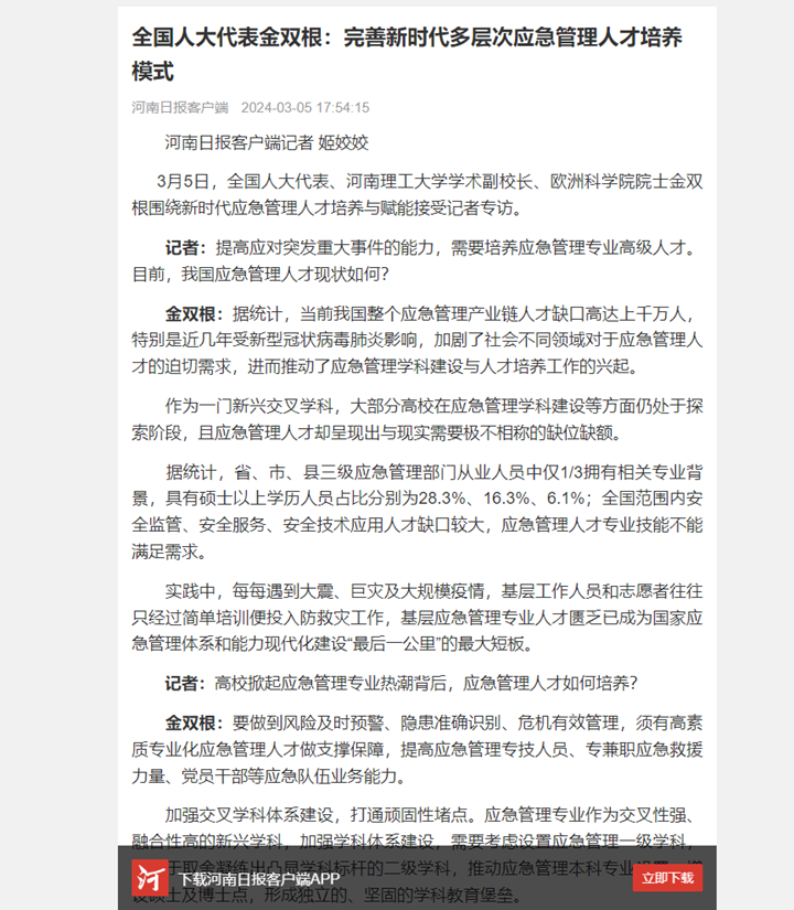 近日,全国人大代表、学术副校长、欧洲科学院院士金双根围绕新时代应急管理人才培养与赋能、加快推进应急公共服务发展等积极建言献策,连日来,河南日报、中国应急管理报、等20家媒体进行了采访报道,具体内容如下: