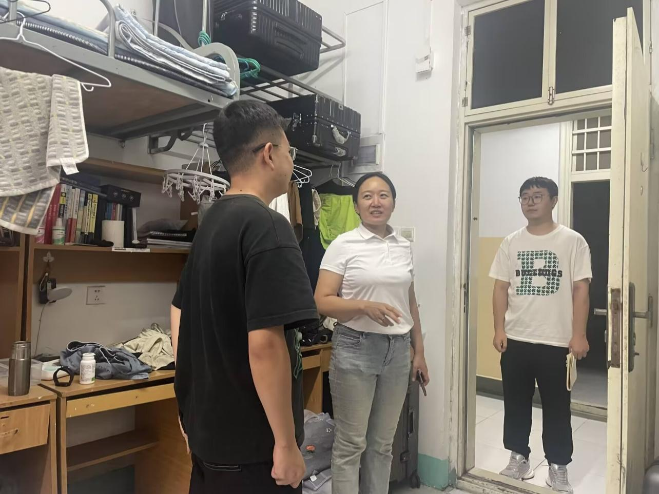 老师们仔细地走访了每一间学院研究生宿舍,排查宿舍是否存在安全隐患,了解他们返校报到的情况,对暂时还未返校报到的学生名单作了摸排统计,确保学生全部安全返校做好准备。走访过程中,王雷霞副书记认真询问了研究生们学习、科研工作的进展,叮嘱大家如果有困难一定要及时和老师联系,学院会努力解决大家遇到的问题和困难,帮助大家更好地迎接新学期的到来。此外,老师们还分享一些就业和求职的理念、经验,并对大家提出的考编问题,作了详细解答。