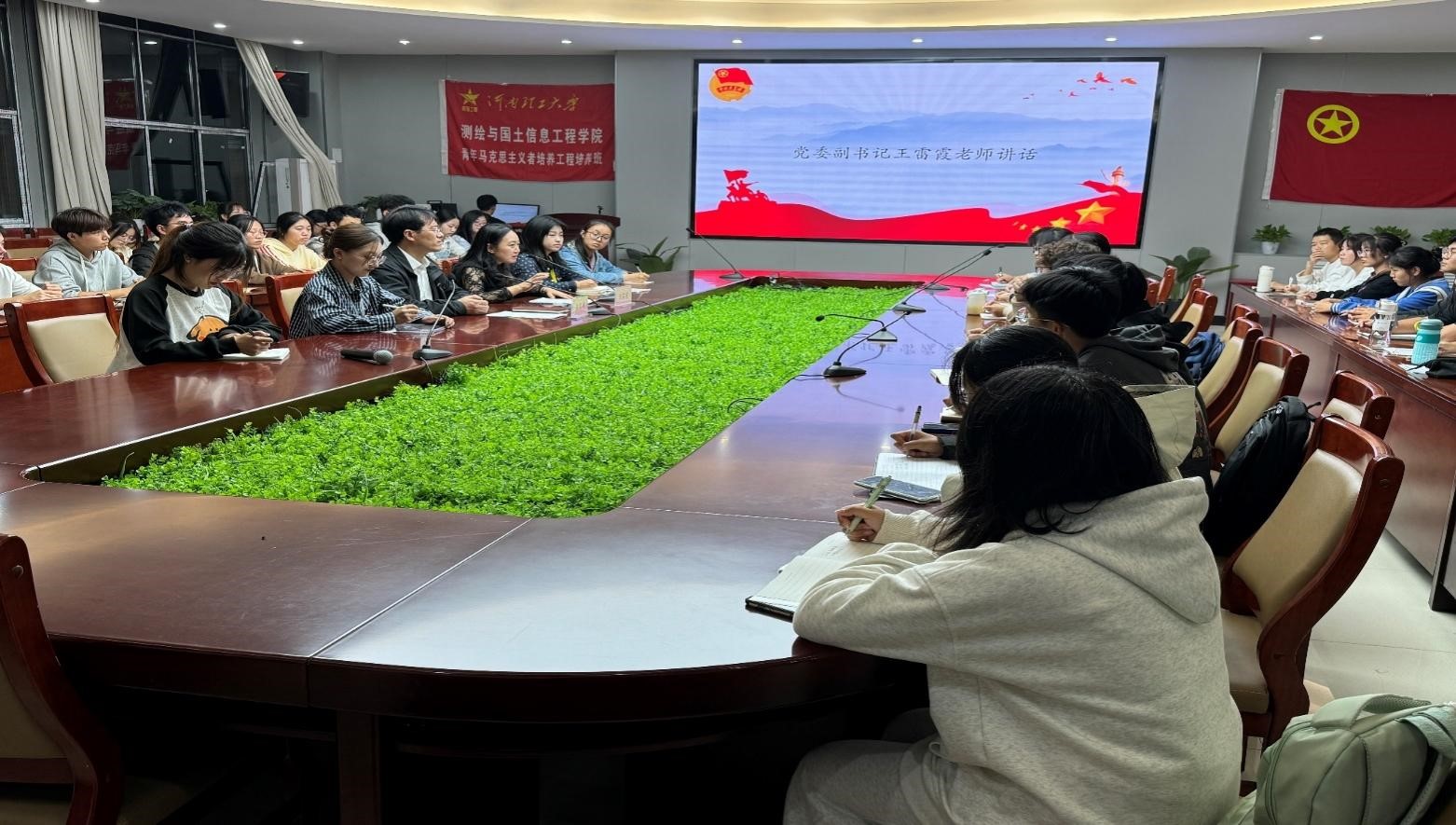 会上,王雷霞对新加入“青马班”的学员表示祝贺,并结合培训课程提出“青马班”的培养目标,进行详细解释。她指出“青马班”学员应在学习和生活中要坚持党的信念,发挥积极能量;同时要坚守马克思主义思想,汲取中华优秀传统文化精髓,推动理论创新与实践的深度融合,并用马克思主义这一锐利思想武器武装头脑。丰习才对“青马班”学员们提出坚定信仰、刻苦学习、敢于担当、树立新风的四项要求,并鼓励学员用良好的道德品质和高尚的人格魅力来获得他人的信任。第十三期“青马班”优秀成员刘贞宇和第十四期“青马班”学生代表杨哲依次上台发言自我收获和目标。组织部程大佳带领全体学员宣誓青马宣言。组织部赵博瀚宣读《“青马班”培训班管理考核方法》。老师与学员们在会议室荧幕前合影留念。