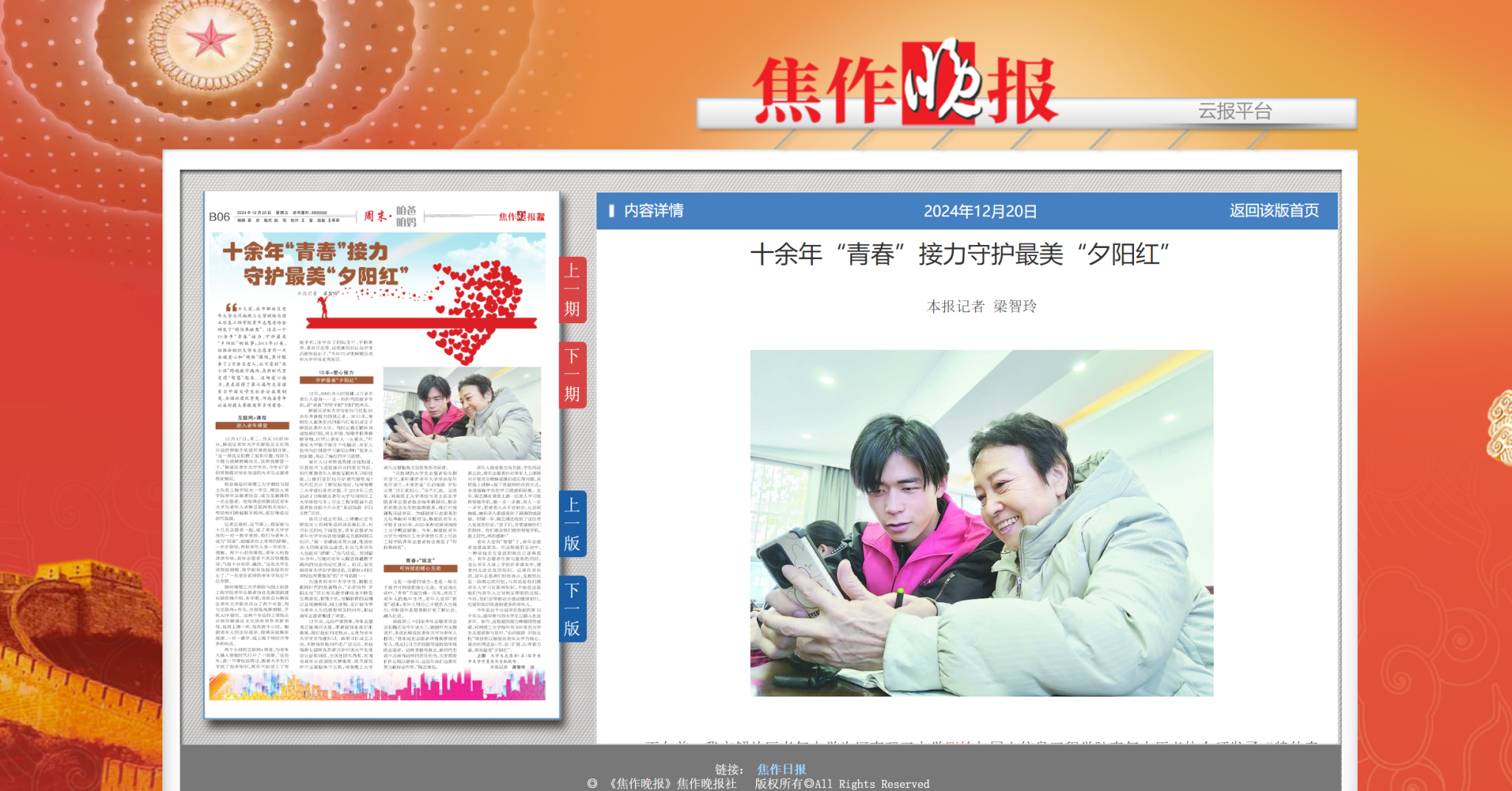 “十余年青春接力,守护最美‘夕阳红’”。自2013年以来,午夜剧场 青年志愿者协会坚持每周在焦作市老年大学开设手机使用课程,以帮助叔叔阿姨们在这个智能设备快速发展的时代跨越数字鸿沟。20241220日,为赞扬志愿者们赤诚爱心与无私奉献,焦作日报特别报道了午夜剧场 青年志愿者协会的老年大学志愿服务项目。