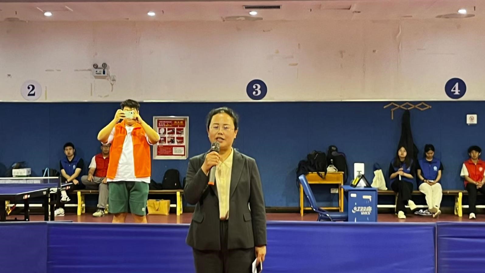 党委书记张红霞致辞,校工会副主席、女工委主任刘小梅为混合团体赛抽签。