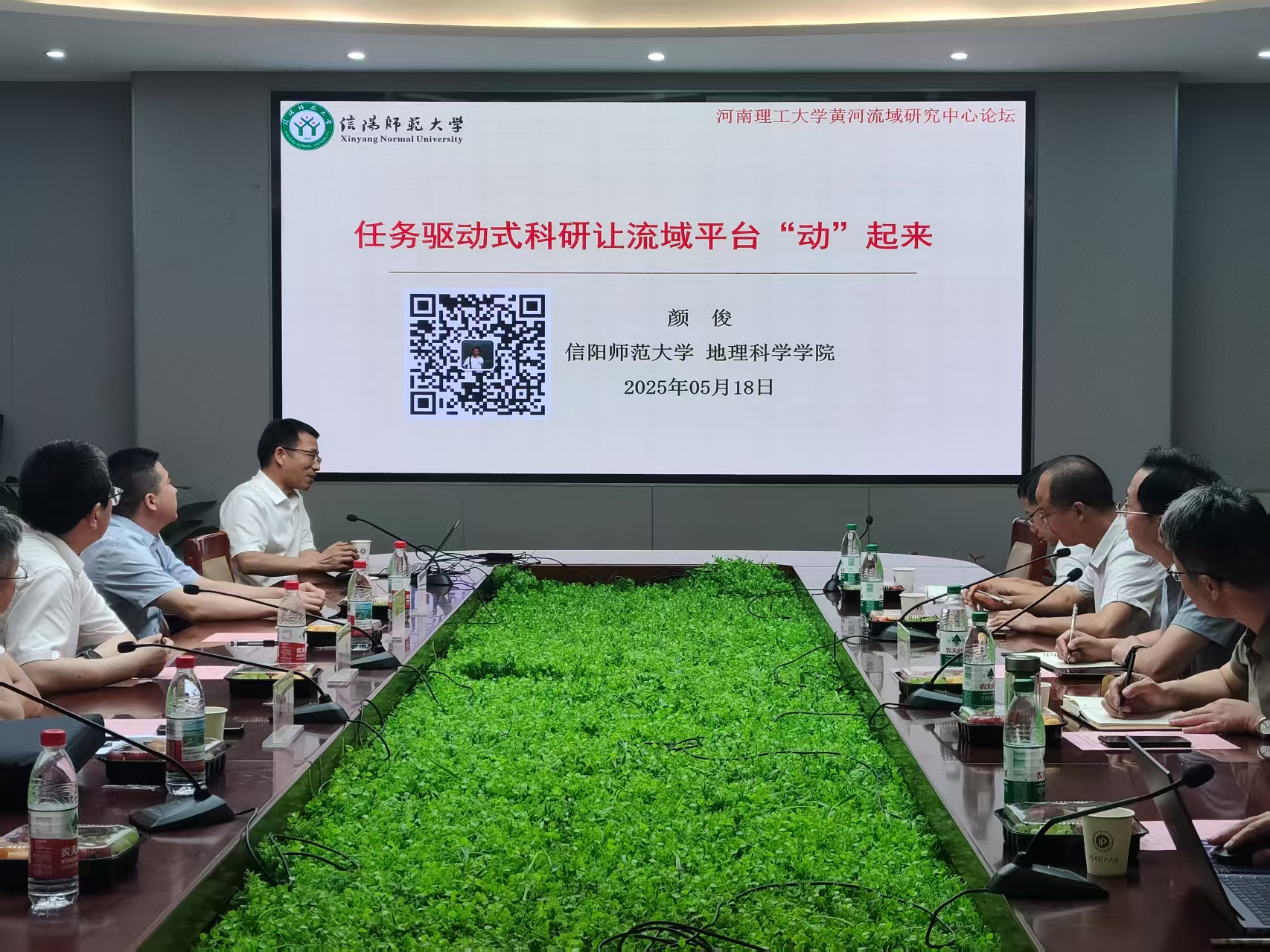 副院长柴华彬致辞并介绍了学院整体情况。黄河流域研究中心主任乔旭宁详细介绍了中心在流域资源保护与城乡高质量发展领域的研究成果及未来规划。学术交流过程中,河南省科学院地理研究所所长鲁鹏做了题目为“环境考古中的古代人地观”的学术报告,从历史视角解析了黄淮流域人地关系的演变,强调环境考古对现代自然资源管理的启示;信阳师范大学地理科学学院副院长颜俊围绕“任务驱动式科研让流域平台‘动’起来”进行交流,提出通过任务导向的科研模式激发流域监测平台的协同创新活力,强调了流域的重要性、待研性和话语权;许昌学院地理与空间信息学院院长闫慧的报告“淮河流域地表水硼污染及源解析”,结合实地数据揭示淮河流域地表水硼污染成因,为流域水环境治理提供了科学依据;洛阳师范学院地理与旅游学院副院长张小虎聚焦“地理空间视角下河南省非物质文化遗产传承保护研究”主题,探讨了地理信息技术在文化遗产保护中的应用潜力。最后,与会专家围绕科研协同平台建设、跨学科合作机制与数据共享平台搭建及人才培养等内容进行了深入研讨。