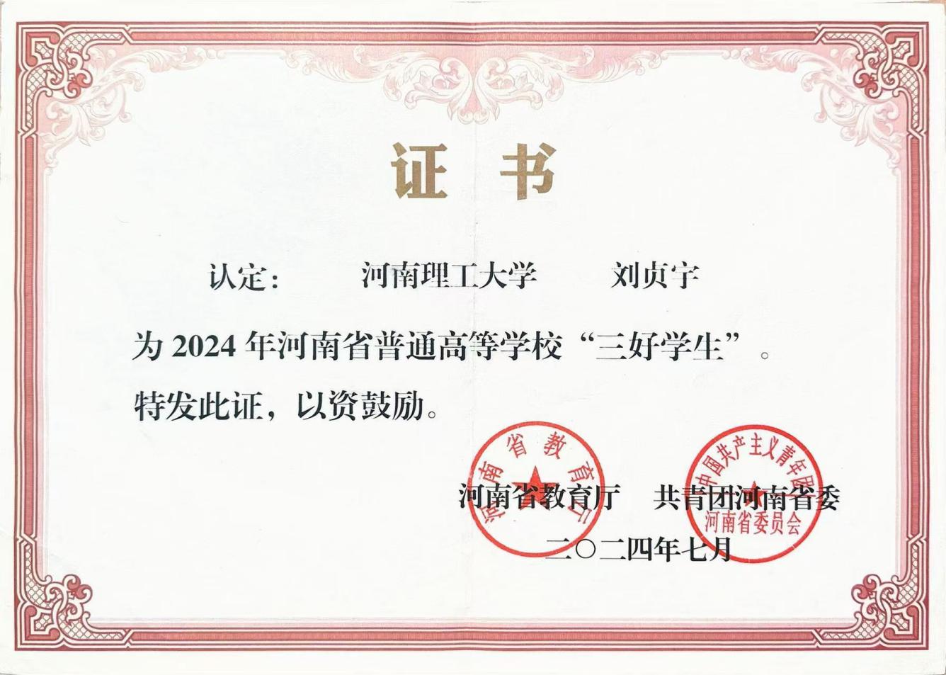 城乡2201班刘贞宇同学以全面的综合素养和突出的个人表现,荣获“全国煤炭行业优秀共青团员”、河南省“三好学生”及校级“文明学生”等称号。这充分体现了她在德、智、体、美、劳等方面的优异发展,彰显了其作为学生骨干的模范引领作用。