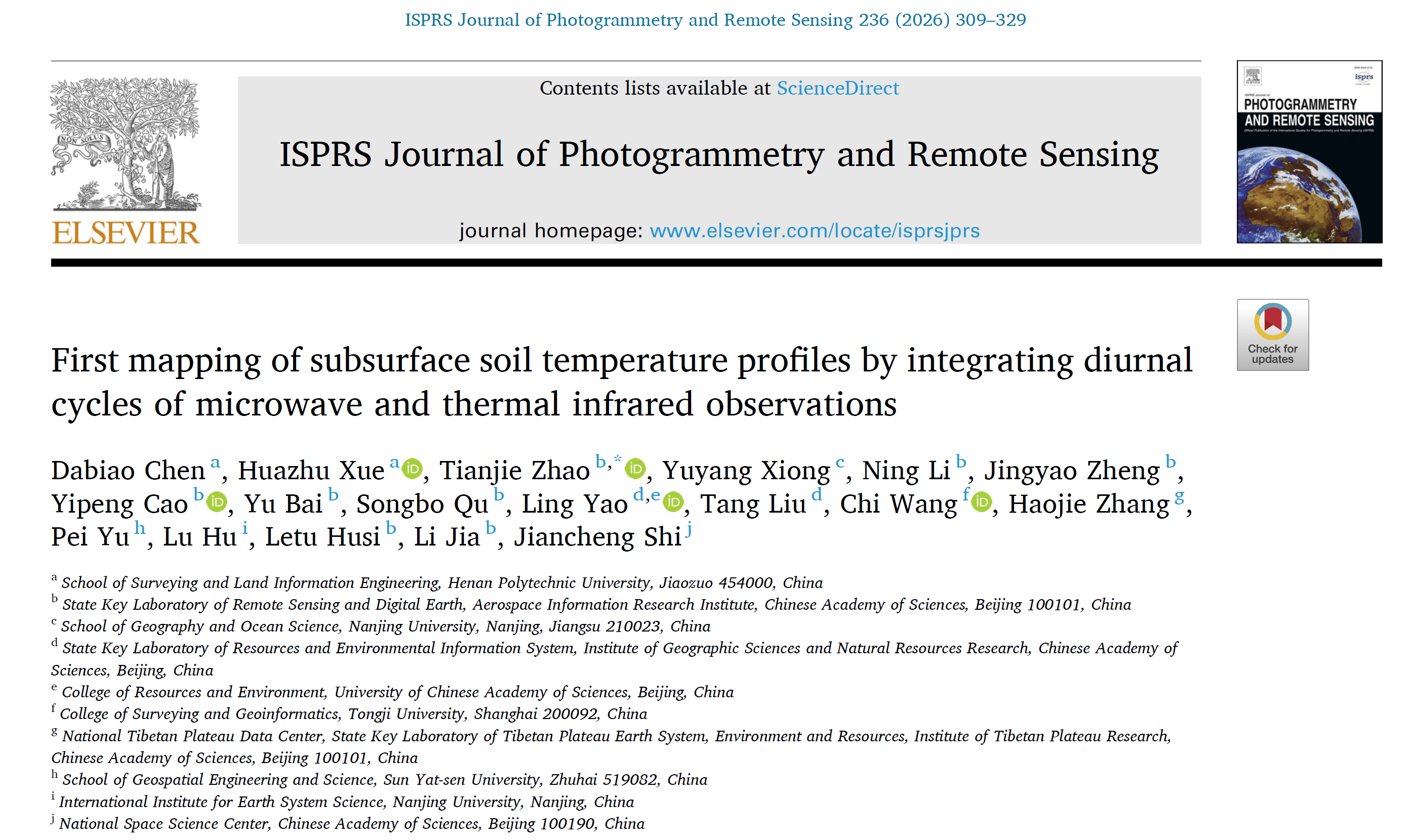 2023级测绘科学与技术硕士生陈达标以第一作者身份在遥感领域权威期刊《ISPRS Journal of Photogrammetry and Remote Sensing》(IF=12.2) 发表题为“First mapping of subsurface soil temperature profiles by integrating diurnal cycles of microwave and thermal infrared observations”的学术论文。