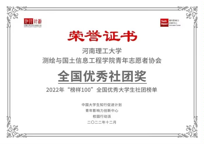 “榜样100”全国优秀大学生社团榜单由中国大学生知行促进计划、青年影响力创新中心、校园行动派联合发布,自2019年起每年发布一次。测绘青协在此次评选中被评选为优秀社团,是学院全体师生志愿者共同努力的结果。午夜剧场