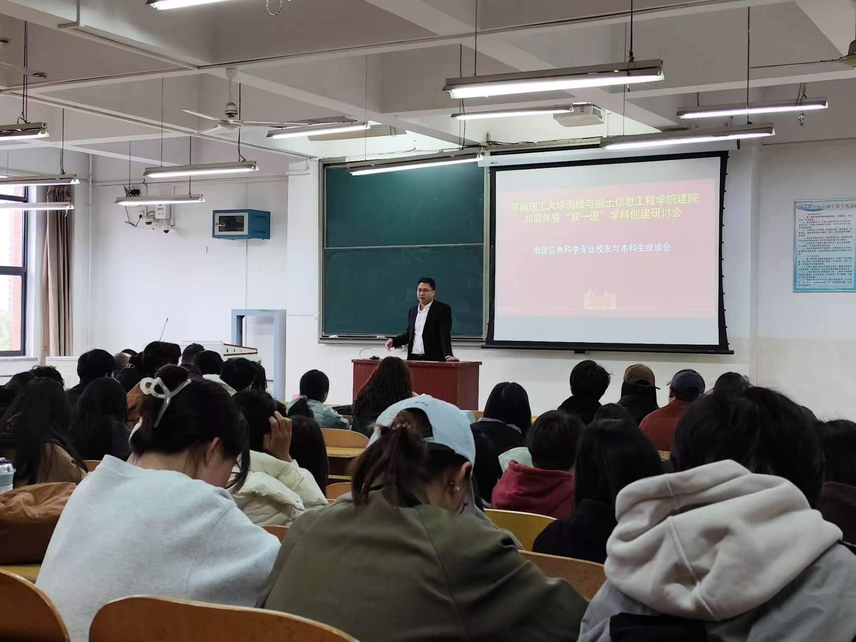 在培养方案修订研讨会上,三位校友与地信系教师进行了充分交流。校友们根据行业发展前景和当前课程设置,建议增设操作系统和地理数据处理方面的人工智能算法等课程,以更好地增强学生培养与社会发展需求之间的契合程度。与本科生座谈会上,王世东主任代表地理信息科学系师生对校友们的归来表示热烈欢迎,对校友们长期以来对母校、学院的关心支持表示衷心的感谢。三位优秀校友依次上台为同学们分享自己的学习经验和工作经历。针对同学们提到的专业未来发展方向、考研与就业选择等问题,三位校友根据自身经历提供了详细深入的指导。座谈会上同学们积极参与交流,气氛轻松活跃,起到了良好的沟通效果。