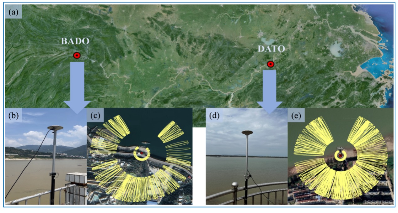 图1. 长江上下游GNSS测站分布和天线覆盖信息。(a) BADO和DATO地理位置;(b)和(d)分别是BADO和DATO站天线和周围环境;(c) BADO站第一菲涅尔区,仰角为 5°和25°;(e)DATO站第一菲涅尔区,仰角为5°和30°。