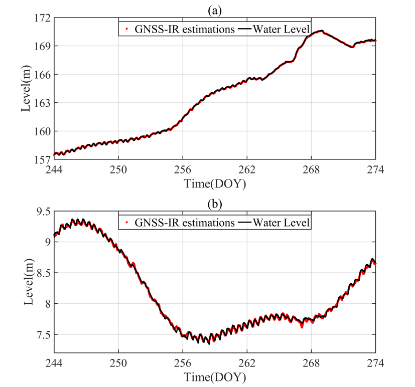 图2. GNSS-IR多系统融合估计结果与水位计实测值比较:(a) BADO和(b) DATO。红色点表示GNSS-IR多系统联合估计结果,黑色线表示水位计实测值。