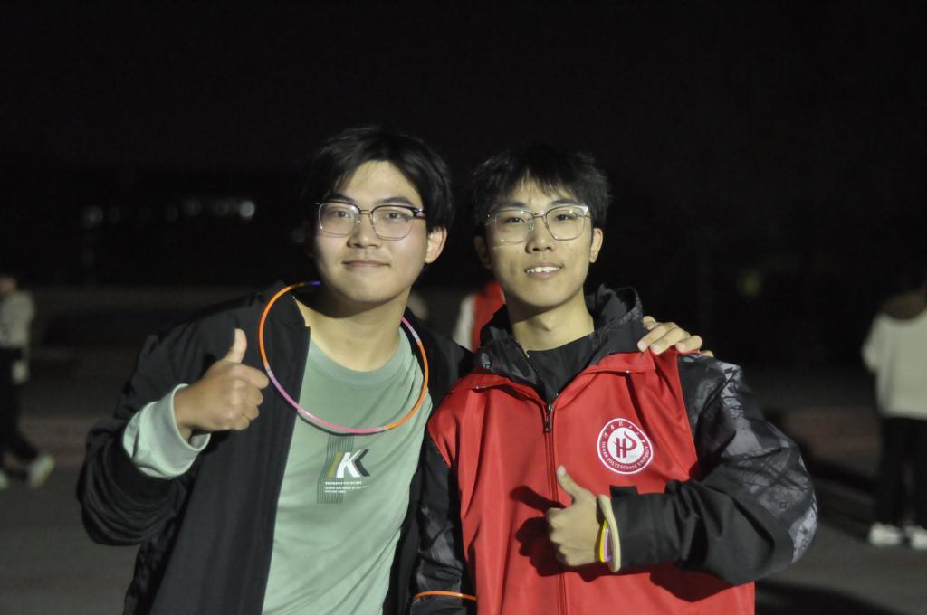 院楼、学校南门三个打卡点处领取贴纸,集齐三个贴纸后,方可领取小礼品。志愿者们一路跟随,处处引导,保证了活动参与者的安全。根根闪烁的荧光棒随着参与者们的脚步闪过校园各处,点亮了夜幕中的校园,更点亮了同学们欢快的笑容。